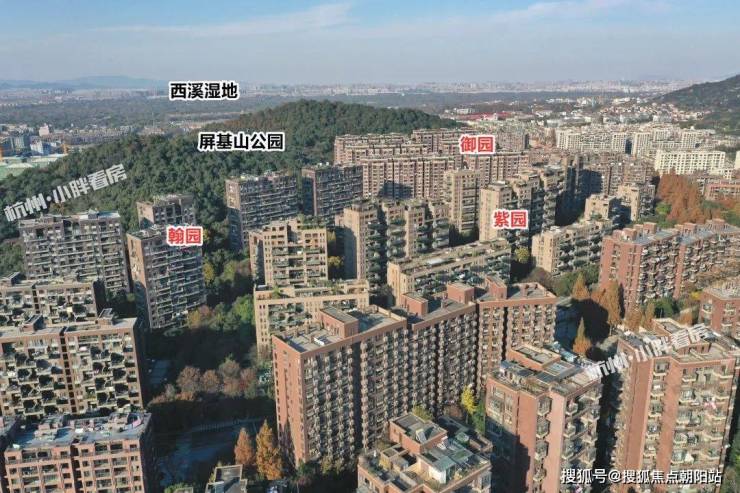 再往北面是和家园小区其他组团,从现场可以感受到小区入住率还是很高的,远处是屏基山公园,山体较矮,适合散步游玩等,再往远处绿油油一片就是杭州名片西溪湿地了: