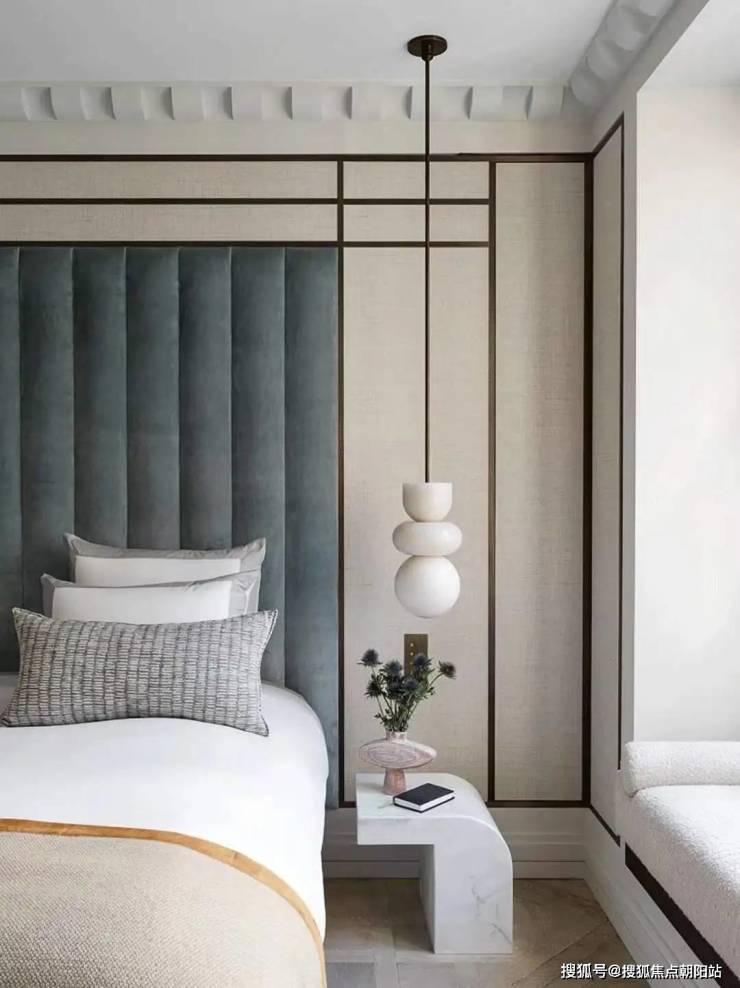 三个卧室都朝南,做了三套房,推开双开门进入主卧,背景墙是蓝绿米黄的墙布和皮革软包,折叠门拉在一边,是一个内包阳台,坐在软榻上看窗外的城隍阁,山峦供白云以家乡,使之倦游而归息。家,不就是让人彻底放松下来的庇护所吗?