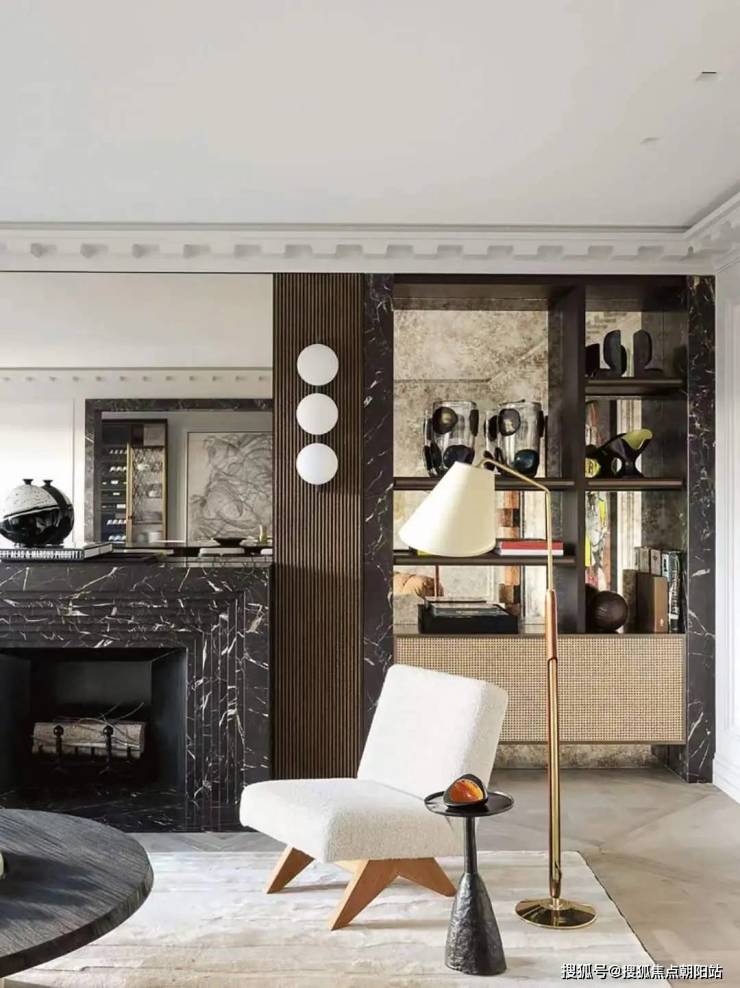 客餐厅三段式功能布局,空间连贯一览无余,让豁亮的心情又无法抗拒。梅维拉的雾化壁炉前是一对单体沙发,既是端景也是空间最好的分割线,一边是家人闲坐,一边是会客品茗。地面满铺鱼骨拼木地板,米黄色编制墙布搭配仿金属漆的星空造型图案,精致又神秘,在13m进深的采光落地窗下,即使再挑剔,也没了脾气。