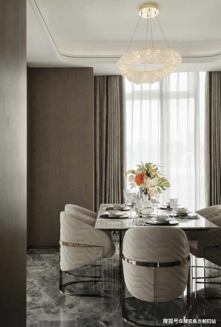 开放的客餐厅打破桎梏,餐桌选择了金属与石材结合的独特设计。在完美的采光环境下,让每一次品尝美食的过程也充满仪式感。水纹座椅呼应房间临江主题,让浮动的波纹化为稳固的装饰,承托住和家人一起分享的美好回忆。