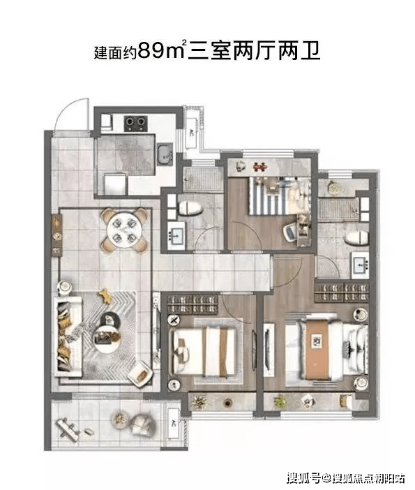 建面约89㎡的洋房3房!相比小高层,得房率更高!居住更阔绰!