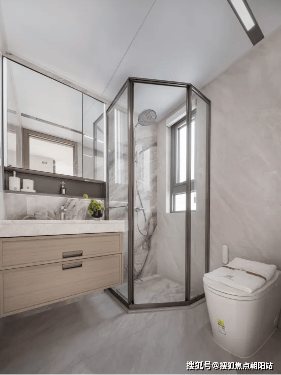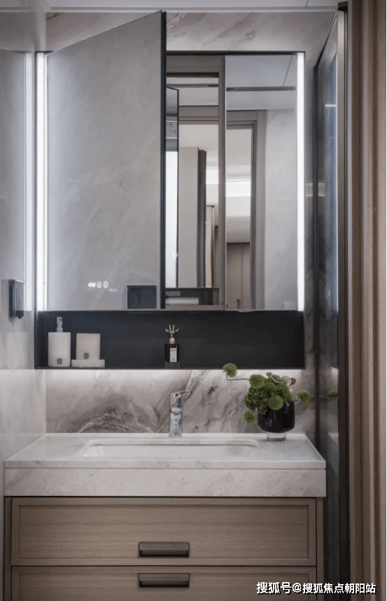 主卫生间配备了智能化的魔镜,该镜面为双面高清设计,内置美妆冰箱功能的镜柜以及卫浴柜,能够实现恒温冷藏。主墙面装饰采用了耐用的岩板材料,内部设计考虑周到,特别预留了四个电源插座,方便电动牙刷、卷发棒以及吹风机等个人护理电器的使用和收纳,同时设有洗脸巾的抽取装置。