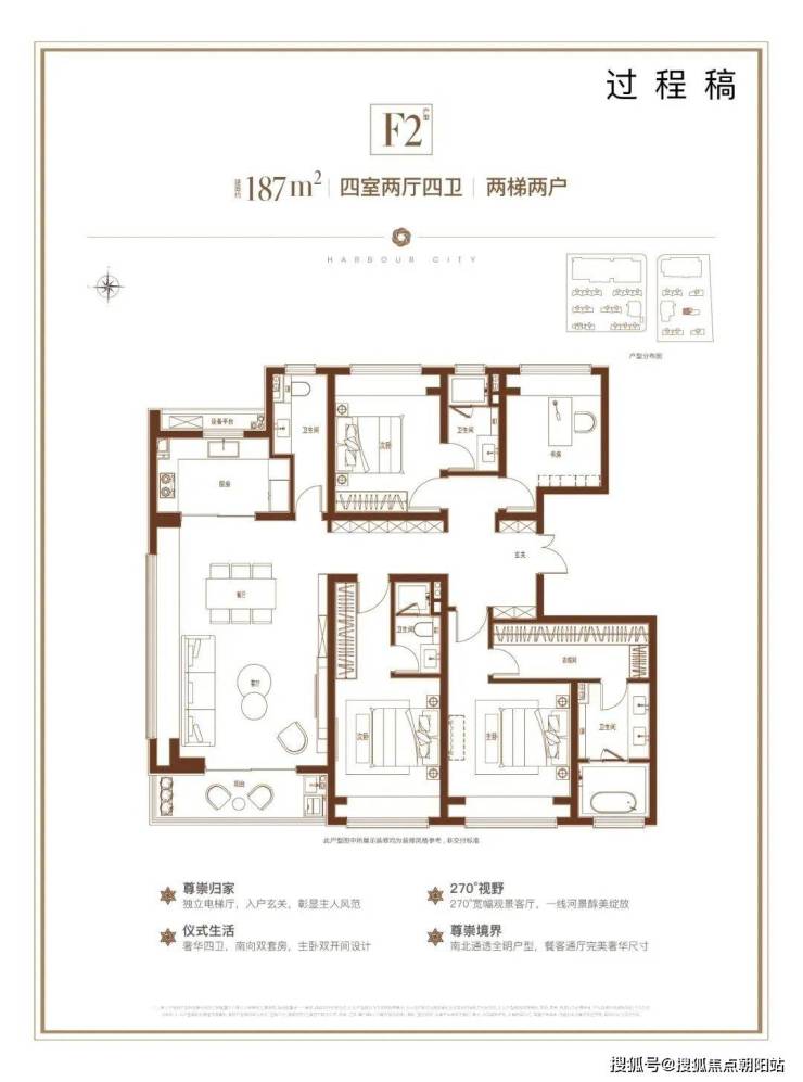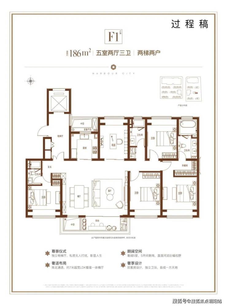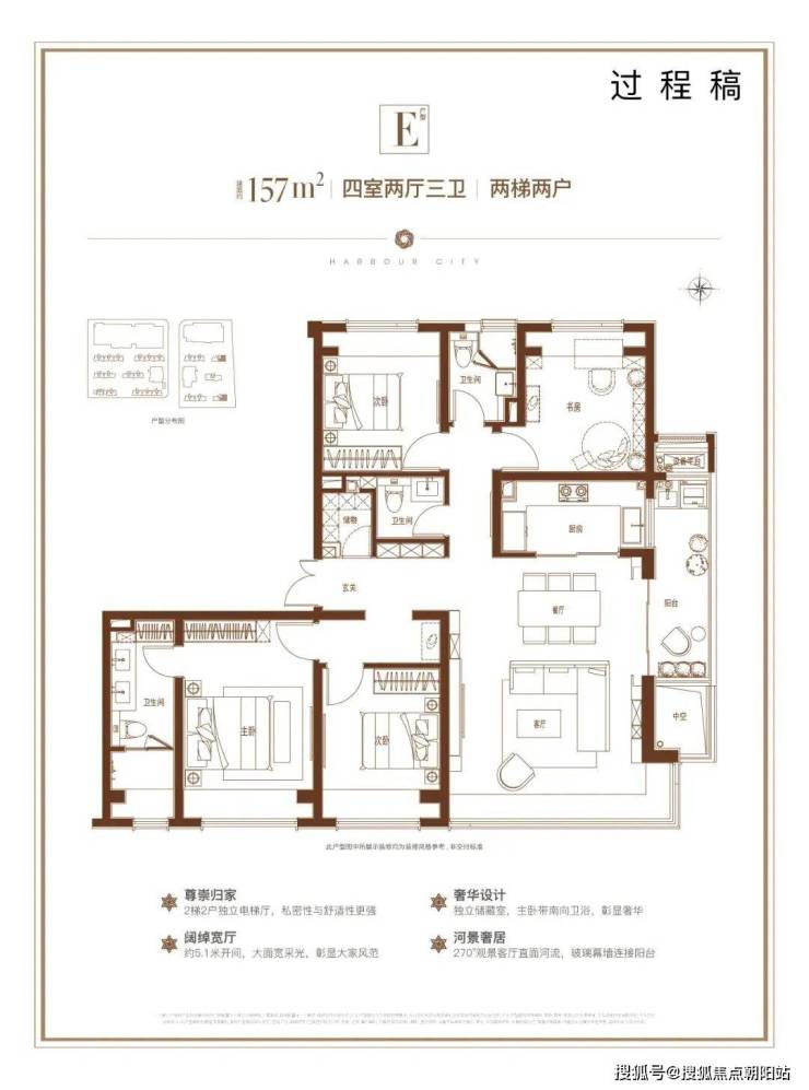 建面约157㎡4房3卫,总价在1005万-1133万之间;建面约186㎡5房3卫、187㎡4房4卫,总价在1219万-1359万之间,一步到位的进阶改善产品。